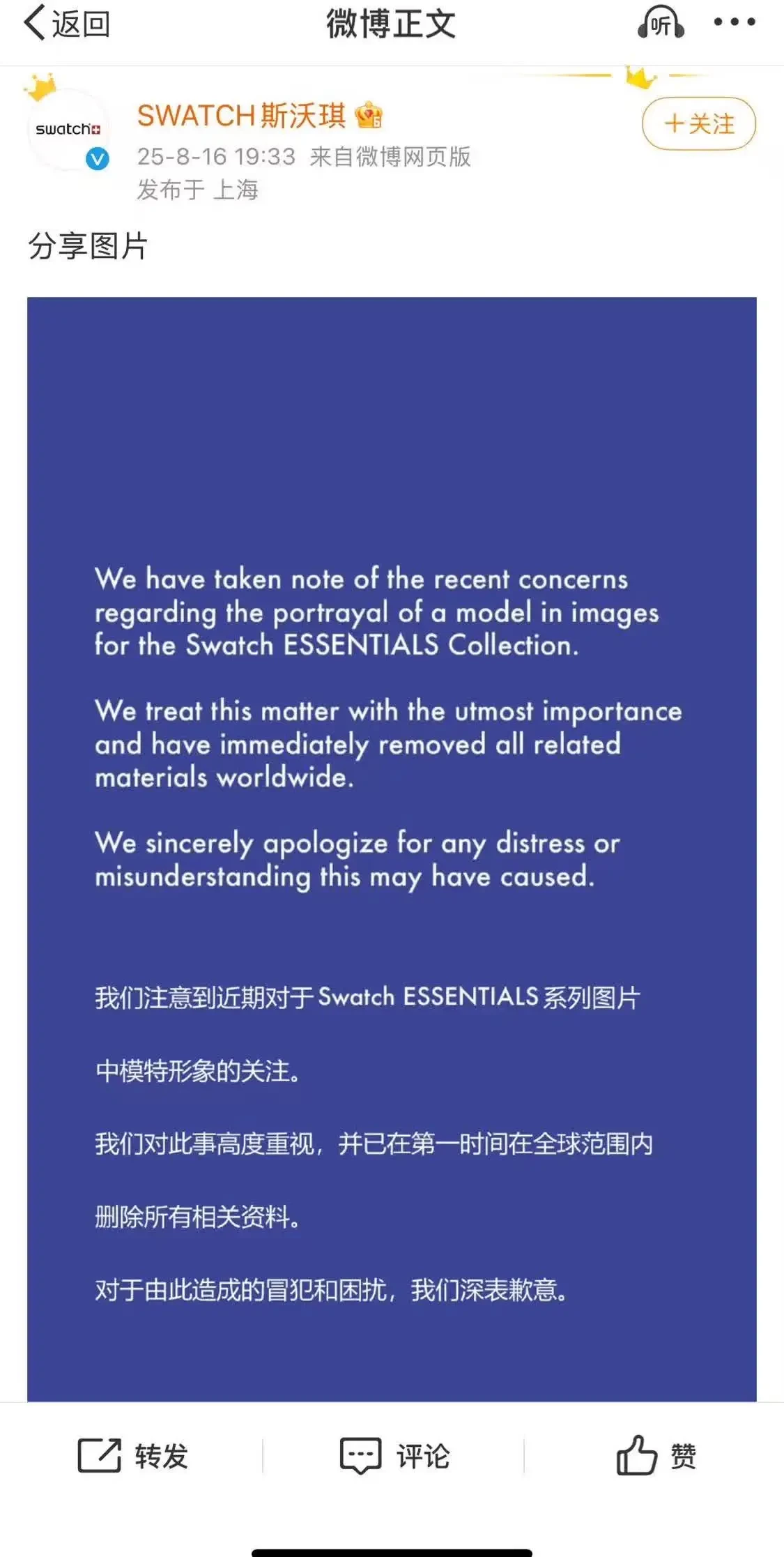翌16日夜、スウォッチ中国公式微博はわずか87文字の「深くお詫び申し上げます」と題する声明を発表。しかしそこには差別的表現であったことの認識も、再発防止策も記されていなかった。さらにポスターは中日韓サイトではひっそり削除された一方、欧米の公式サイトではそのまま掲載され続け、「消費者を見て態度を変える」と批判された。48時間以内で関連話題の閲覧数は32億を突破し、否定的な世論が60%以上を占めた。